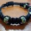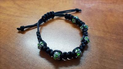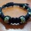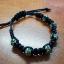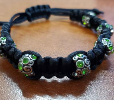 Black bracelet with metal beads and green stones, woven in macrame style.