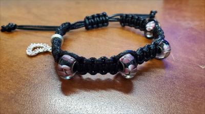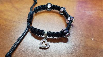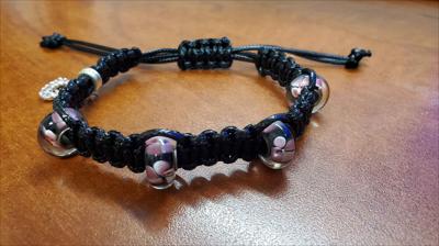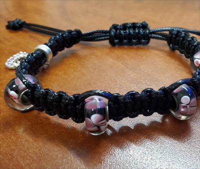 Black macrame bracelet with glass beads with pink flowers and a heart.