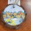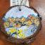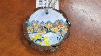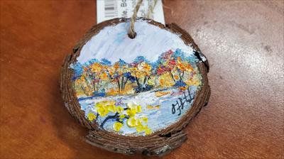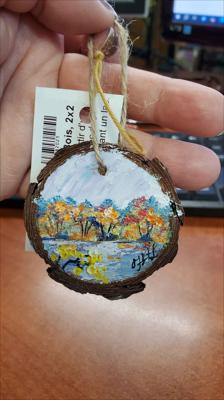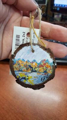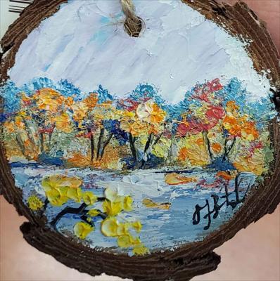 Pendant made from a sawn tree circle with a landscape of the first ice on the river, painted with oil paints.