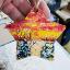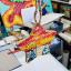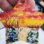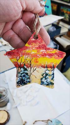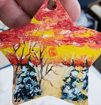 A star-shaped painting of a frosty sunset landscape, painted with oil paints and a palette knife on wood.