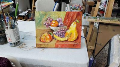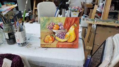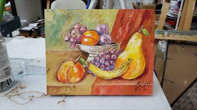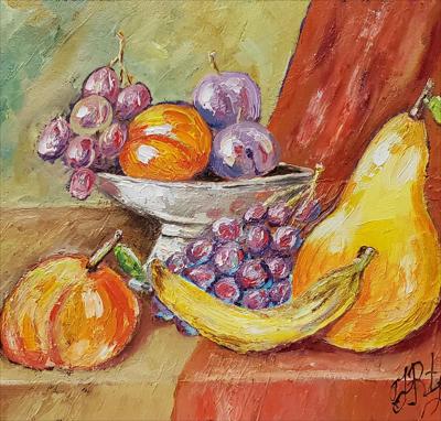 Wonderful and beautiful fruit, a summer gift for us. Big pear, blue grape, banana and peach, together they are energetic and positive. Original painting size 8x10 inches.